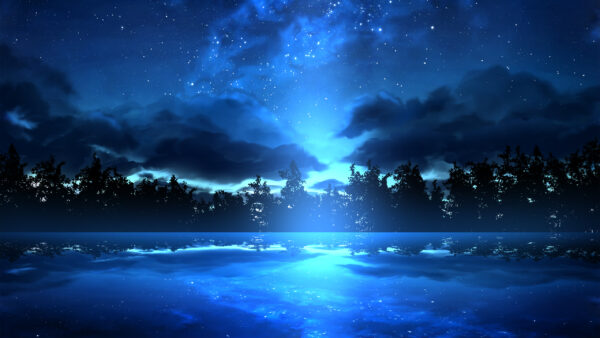 Wallpaper Starry, River, Blue, Forest, Anime, Trees, Reflection, Sky, Nature